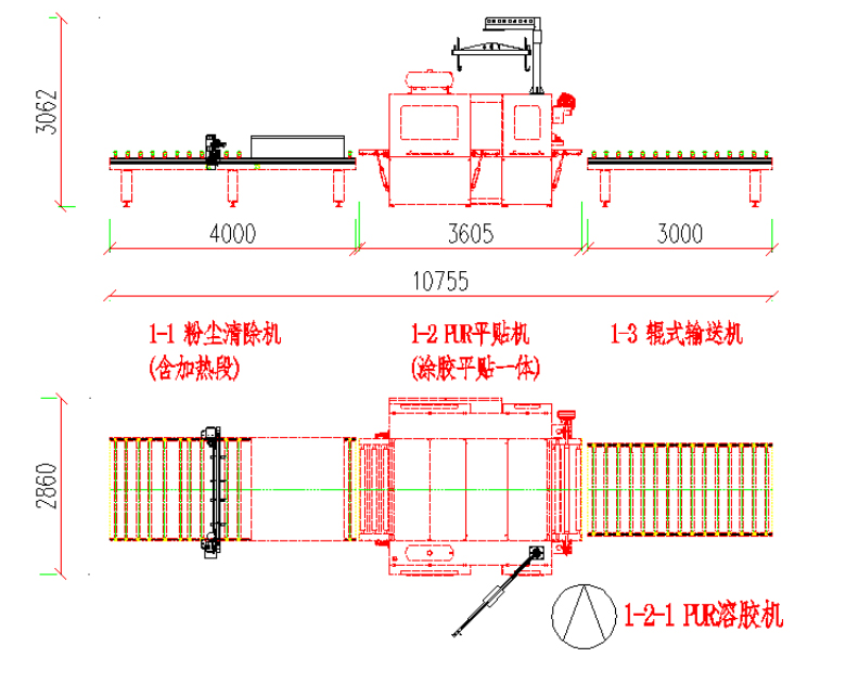 本生產(chǎn)線由:粉塵清除機 — PUR平貼機(含溶膠系統(tǒng)) — 輸送機等部分組成。