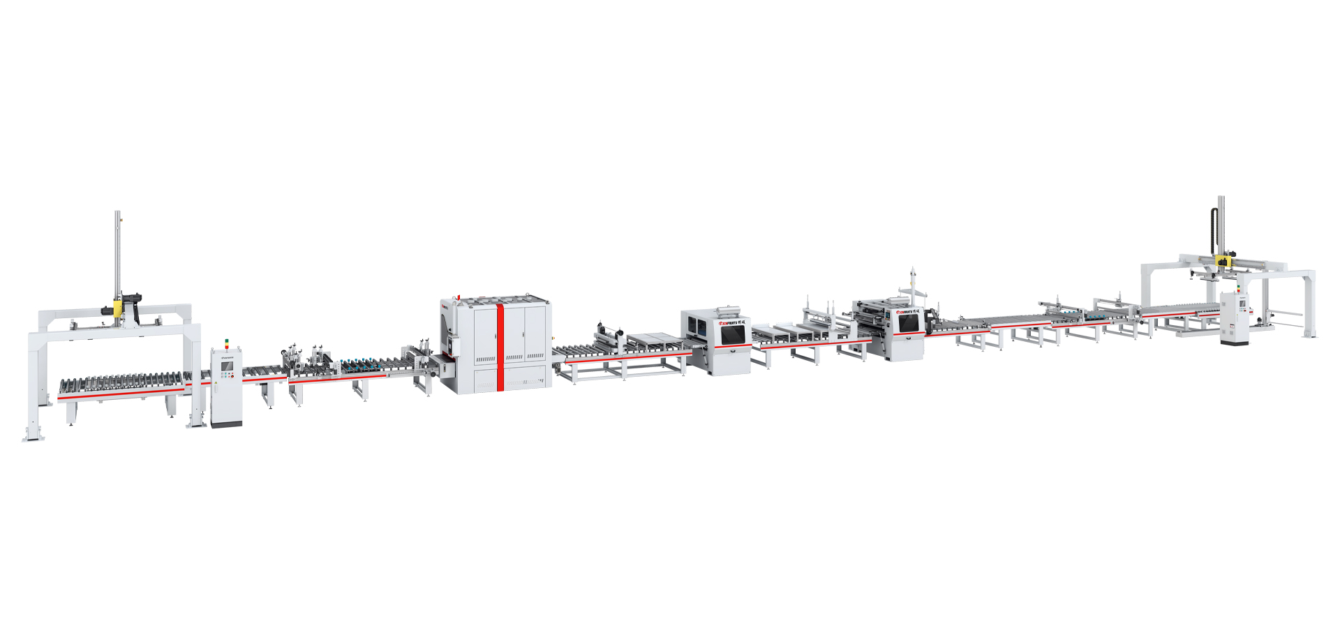 本生產(chǎn)線由:龍門上下料機 — 對中輸送機 — 輸送機 — 倒角機 — 砂光機 — 粉塵清除機 — PUR涂膠機(含溶膠系統(tǒng)) — 恒溫隧道 — 平貼機 — 斜切機 — 輸送機 — 精密修邊機 — 輸送機 — 對中輸送機 — 龍門上下料機 — 拉膜機等部分組成。
