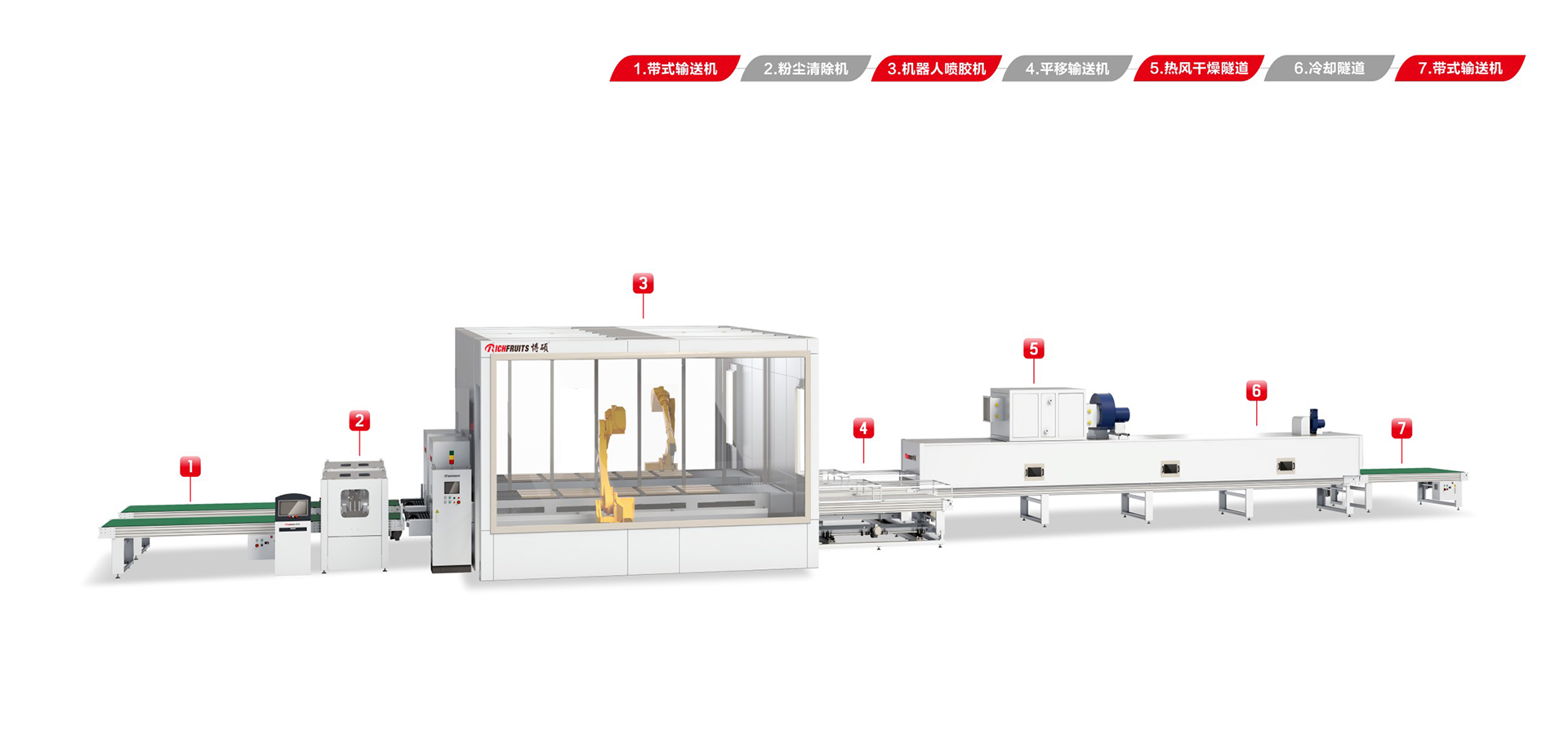 適用于板式家具、實木門、櫥柜門、工藝品、裝飾板、硅酸鈣板、玻鎂板、水泥纖維板的板式加工件的平面和四個側(cè)邊進(jìn)行高質(zhì)量、大批量連續(xù)噴漆。
