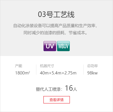 工藝要求 UV底漆、水性色漆、水性LED-UV面漆 產(chǎn)品種類 膜壓PVC櫥柜門板、定制衣柜、線條 產(chǎn)線數(shù)量 3條 設(shè)備特色 LED-UV固化系統(tǒng)、立體干燥房配2臺(tái),待干1小時(shí) 生產(chǎn)產(chǎn)能 UV底漆噴涂線:1800m2/8h (生產(chǎn)員3人/線)