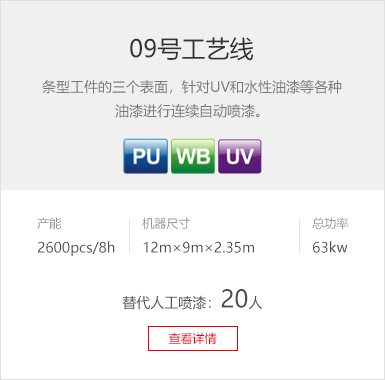 工藝要求 UV底漆、水性色漆、水性LED-UV面漆 產(chǎn)品種類 膜壓PVC櫥柜門板、定制衣柜、線條 產(chǎn)線數(shù)量 4條 設(shè)備特色 LED-UV固化系統(tǒng)、立體干燥房配1臺(tái),待干45分鐘 生產(chǎn)產(chǎn)能 UV底漆噴涂線:1800m2/8h ( 生產(chǎn)員3人/線)