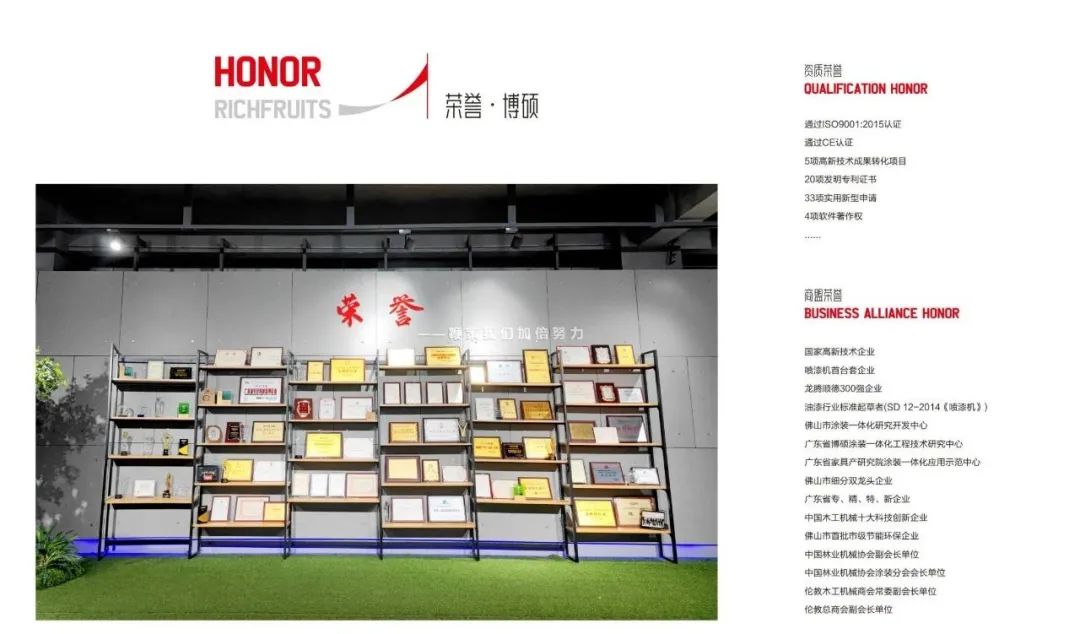 公司在客戶方案的設(shè)計(jì)方面擁有業(yè)界頂級的專家,在研究開發(fā)上運(yùn)用德國、意大利先進(jìn)的技術(shù)平臺,研發(fā)制造出滿足木制品和綠色建材行業(yè)需求的具有自主知識產(chǎn)權(quán)的自動(dòng)化涂裝生產(chǎn)線,并提供專業(yè)的一體化的整體解決方案、技術(shù)支持和售后服務(wù)。博碩公司已通過SO9001:2015認(rèn)證、CE認(rèn)證,是國家高新技術(shù)企業(yè),廣東省專、精、特、新,是噴漆機(jī)行業(yè)標(biāo)準(zhǔn)起草者。