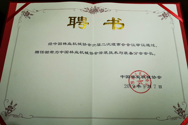 2019年9月7日,《中國林業(yè)機械協會涂裝技術與裝備分會》在上海迪利特大酒店召開成立大會,經中國林業(yè)機械協會六屆二次理事會會議審議通過,聘任博碩公司董事長謝君為《中國林業(yè)機械協會涂裝技術與裝備分會》會長。