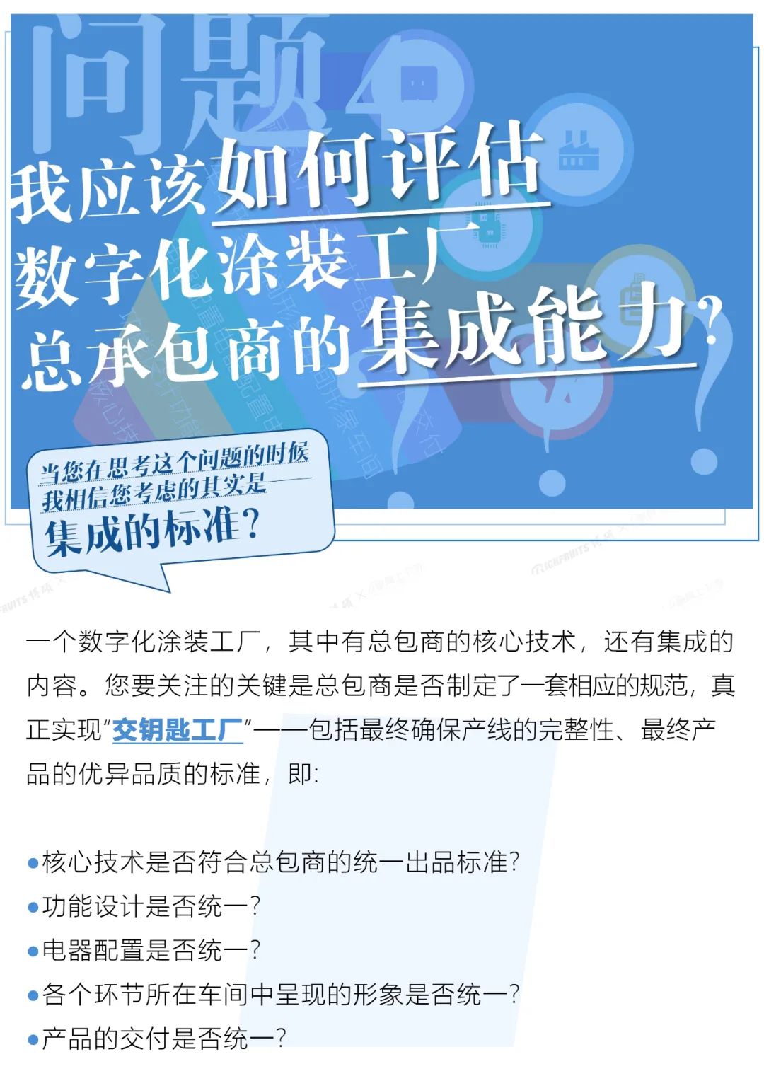 基于多元化材料,以及涂裝工藝本身的專業(yè)性,一個投資有效的數(shù)字化涂裝工廠和羅馬城一樣,并不容易建,更不是朝夕之間就能建立起來的。那么,有這樣需求的您在考慮上述的需求與解決方式的時候,您一定要從以下5件事先去思考和判斷。