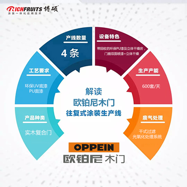 歐鉑尼木門運用博碩實木復(fù)合門PU&WB自動噴涂+立體干燥生產(chǎn)線,配置兩臺噴漆機和一臺翻面機,雙面一次性完成噴涂,能夠?qū)ν苛线M行回收利用,可以噴涂PU\NC\WB。