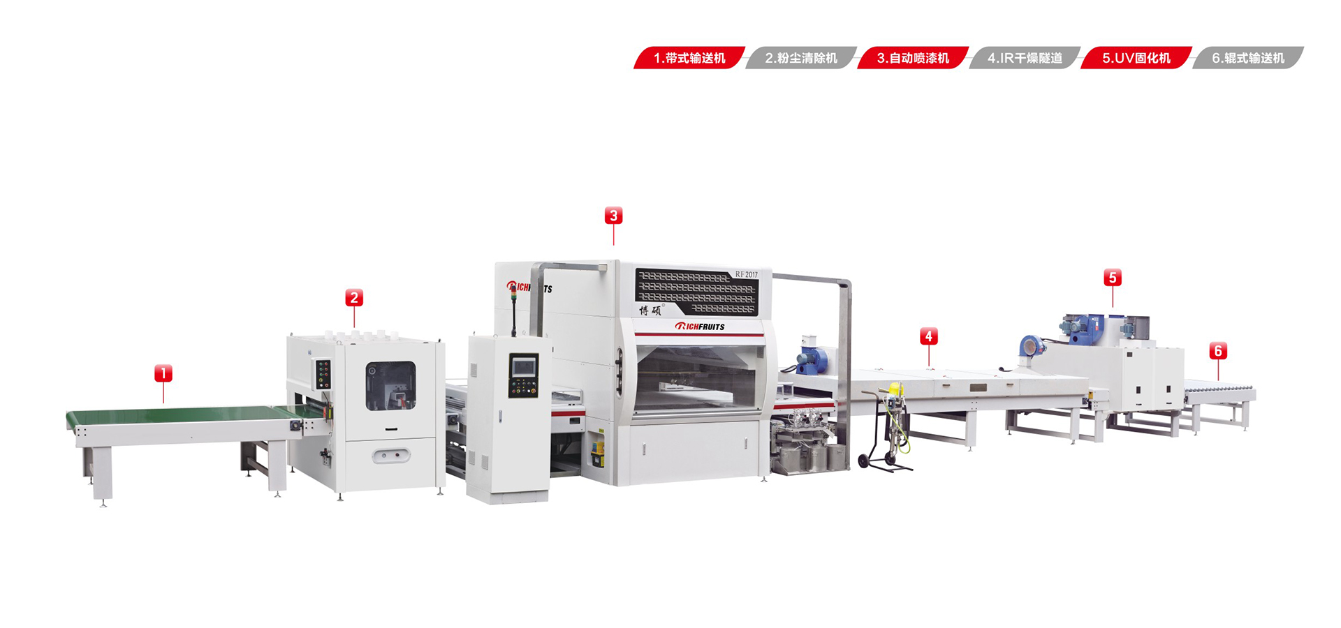 適用于板式家具、實木門、櫥柜門、工藝品、裝飾板、硅酸鈣板、玻鎂板、水泥纖維板的板式加工件的平面和四個側邊進行高質量、大批量連續(xù)噴漆。