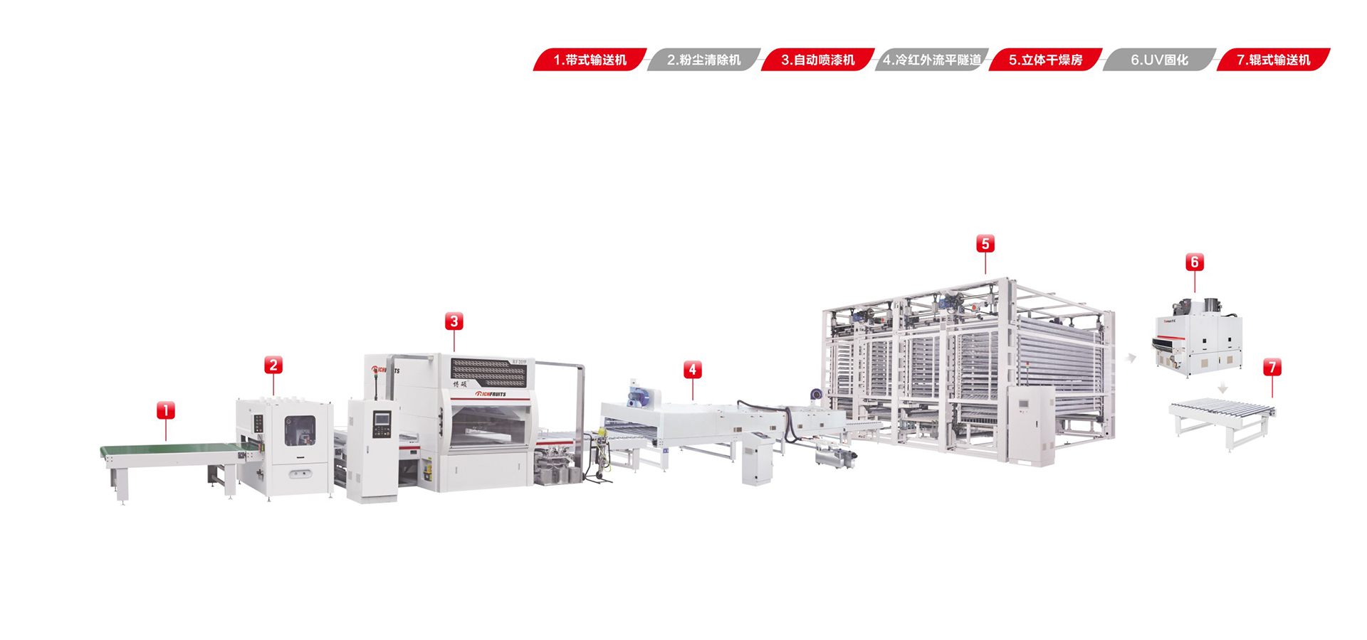 適用于板式家具、實木門、櫥柜門、工藝品、裝飾板、硅酸鈣板、玻鎂板、水泥纖維板的板式加工件的平面和四個側(cè)邊進行高質(zhì)量、大批量連續(xù)噴漆。