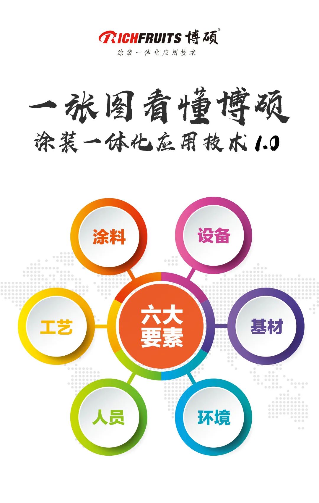 涂裝一體化解決方案2.0的前身叫“涂裝一體化應用技術1.0”,是指由博碩綜合設備、油漆等完成打包交付。博碩總結出了影響涂裝的6個方面,即