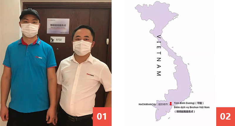 ?? gi?i quy?t s? xa x?i c?a vùng mi?n, rào c?n ng?n ng?, yêu c?u v? k? n?ng s?n xu?t lành ngh? và d?ch v? sau bán hàng k?p th?i, Boshuo ?? thành l?p “?i?m d?ch v? Boshuo Vi?t Nam” t?i Vi?t Nam.